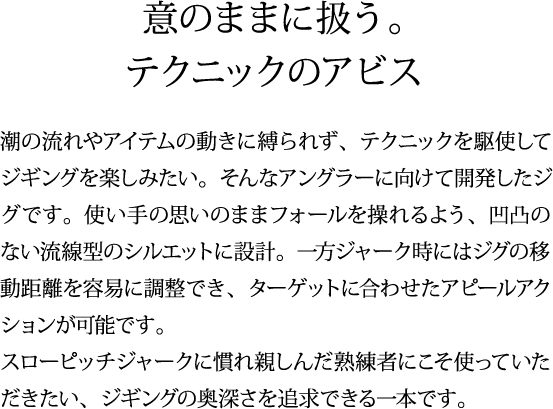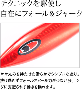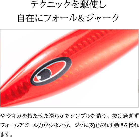青物狙いにも、遊泳力の劣る桹魚狙いにも活躍するジグです。高知・沖縄・鹿児島県沖などで行ったテストでも大物をキャッチ。徳之島では47・48kgのカンパチをキャッチしています。※全魚種対応