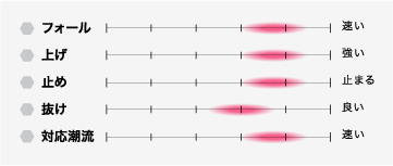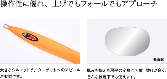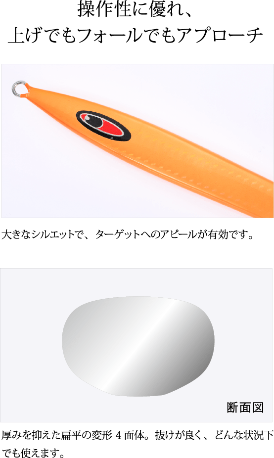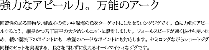 回遊性のある青物も、警戎心の強い中深海の魚も擭得できるジグです。高知・静岡・鹿児島・沖縄・和歌山県沖などのテストでは、カンパチやアカムツなど様々魚種をキャッチしました。※全魚種対応