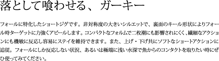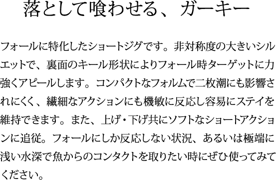 どんな水深でも違和感なく使える、万能のジグです。高知・沖縄県などで実施したテストでは、幻の魚・大型アラを連発しました。