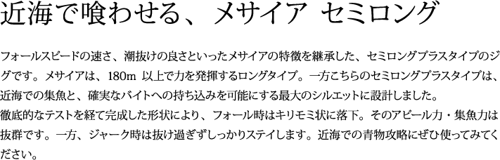 近海で青物に強力アピール、バイトをものにできるジグです。鹿児島・福岡県沖のテストでも、カンパチ・ヒラマサ・ブリを攻略し、高知・静岡・青森県沖での中深海でアカムツなども攻略しました。※全魚種対応