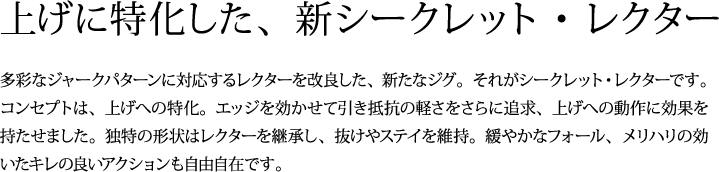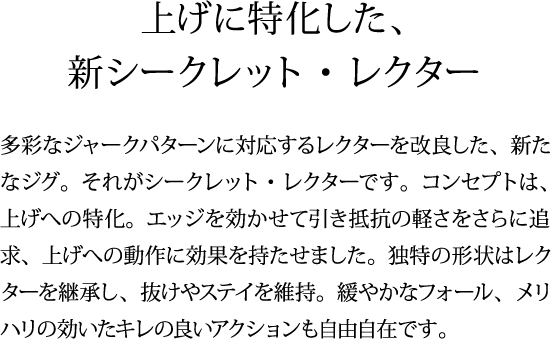 幅広いターゲットに力を発揮します。高知・沖縄・鹿児島県沖などのテストでも様々な魚種を擭得。徳之島では、カンパチやGT (ロウニンアジ)を連発しました。※全魚種対応