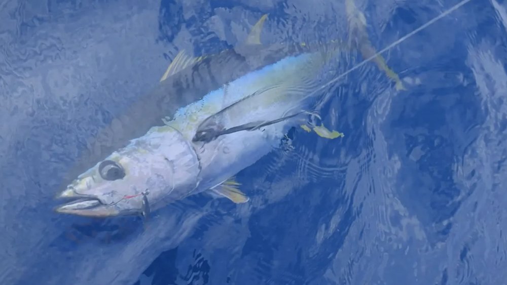 大人気のサワラゲームに【タイベイト】で挑戦。 リアのブレードにフックを装着して、あとは落として巻くだけ。 スイムアンドチェイ…